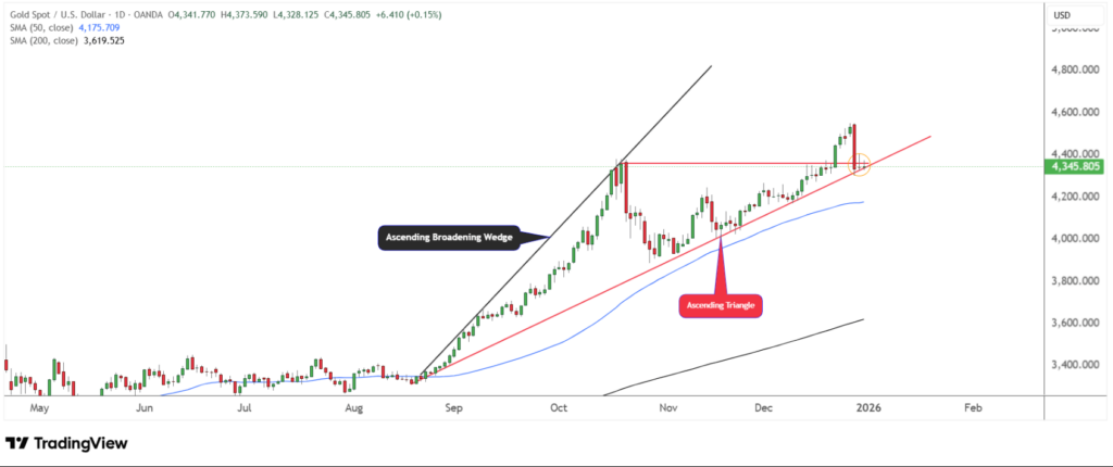 Trên khung thời gian ngày, giá vàng đã điều chỉnh về vùng hỗ trợ của mô hình Ascending Broadening Wedge – mô hình từng bứt phá khỏi Ascending Triangle trước đó. Hiện tại, giá đang tích lũy quanh vùng hỗ trợ then chốt 4.300 USD, cho thấy thị trường đang “nén lực” cho nhịp đi tiếp.