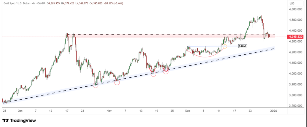 Giá vàng giảm từ đỉnh 4.550 USD và đang đi ngang trong vùng hỗ trợ (vùng đỏ).