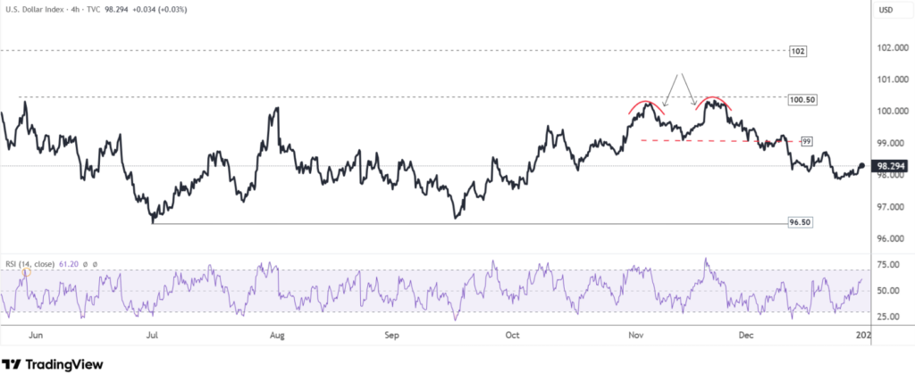 Trên khung 4 giờ, chỉ số USD đã hoàn tất mô hình Double Top tại 100.50, sau đó phá vỡ mốc 99.00, kích hoạt xu hướng giảm.