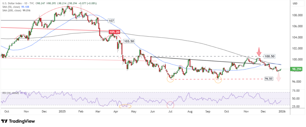 Trên khung ngày, DXY vẫn nằm dưới cả MA50 và MA200, xác nhận cấu trúc giảm trung – dài hạn.