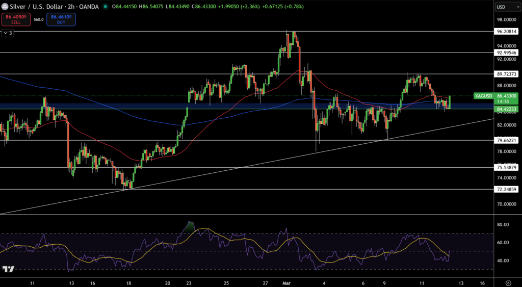 Giá bạc hiện giao dịch quanh 86 USD/oz, sau khi bật lên từ vùng hỗ trợ quan trọng 84.42 USD.