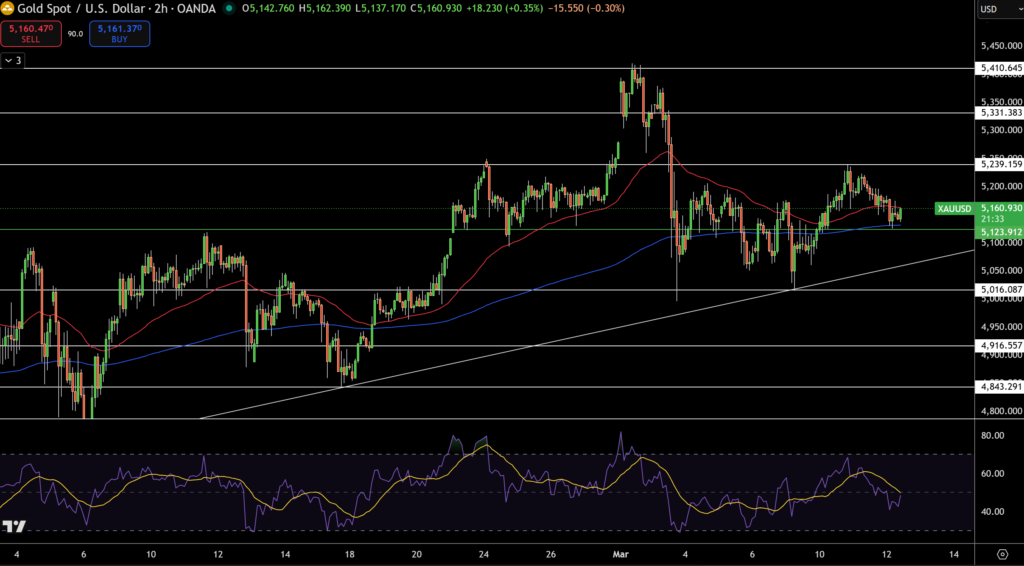 Trên biểu đồ 2 giờ, giá vàng đang dao động trong vùng 5.123 – 5.239 USD, cho thấy thị trường vẫn đang trong trạng thái chờ đợi tín hiệu mới.