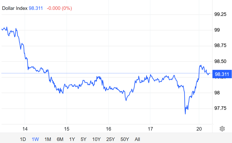 Chỉ số Đô la Mỹ (DXY) – thước đo sức mạnh của USD so với rổ 6 đồng tiền chủ chốt – ghi nhận mức tăng nhẹ, dao động quanh ngưỡng 98,30 trong phiên giao dịch châu Á ngày thứ Hai. Đà tăng của đồng bạc xanh được hỗ trợ bởi tâm lý thận trọng của nhà đầu tư trước những diễn biến mới tại Trung Đông.