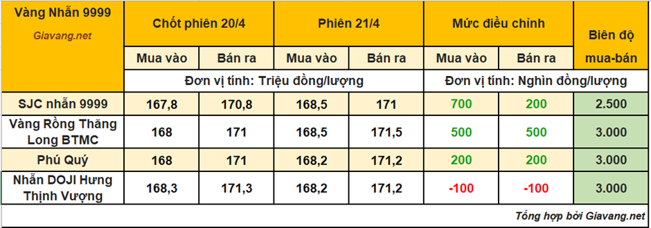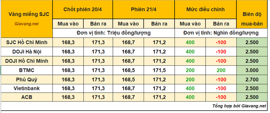 DOJI Hà Nội và Hồ Chí Minh, niêm yết giao dịch mua – bán ở mức 168,7 – 171,2 triệu đồng/lượng, giá mua tăng 400 nghìn và giá bán hạ 100 nghìn so với cuối ngày 20/4.