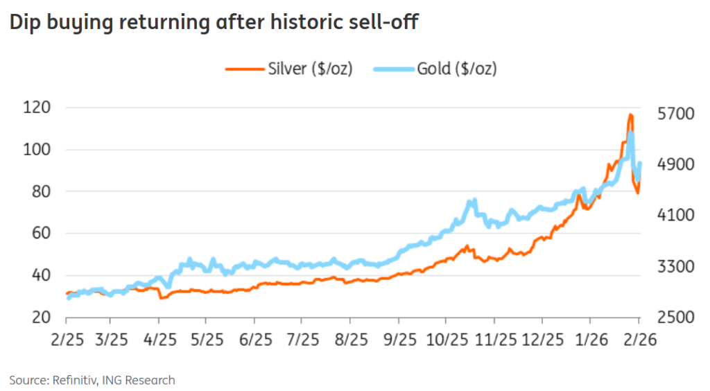 Thị trường vàng và bạc vừa trải qua một trong những đợt điều chỉnh mạnh nhất trong hơn một thập kỷ, tuy nhiên theo ING, cú sụt giảm này mang tính “tái cân bằng” hơn là đảo chiều xu hướng. Sau khi giá được “reset”, kim loại quý được kỳ vọng sẽ tiếp tục tăng trở lại theo hướng ổn định và bền vững hơn trong trung hạn.