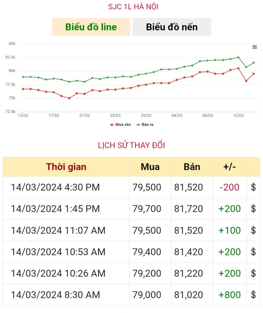 Cập nhật lúc 17h, ngày 14/3, SJC Hà Nội niêm yết giao dịch mua – bán tại mốc 79,50 – 81,52 triệu đồng/lượng, giảm 200.000 đồng/lượng sau khi đạt 79,70 – 81,72 triệu đồng/lượng, nhưng vẫn tăng 500.000 đồng/lượng so với giá mở cửa.