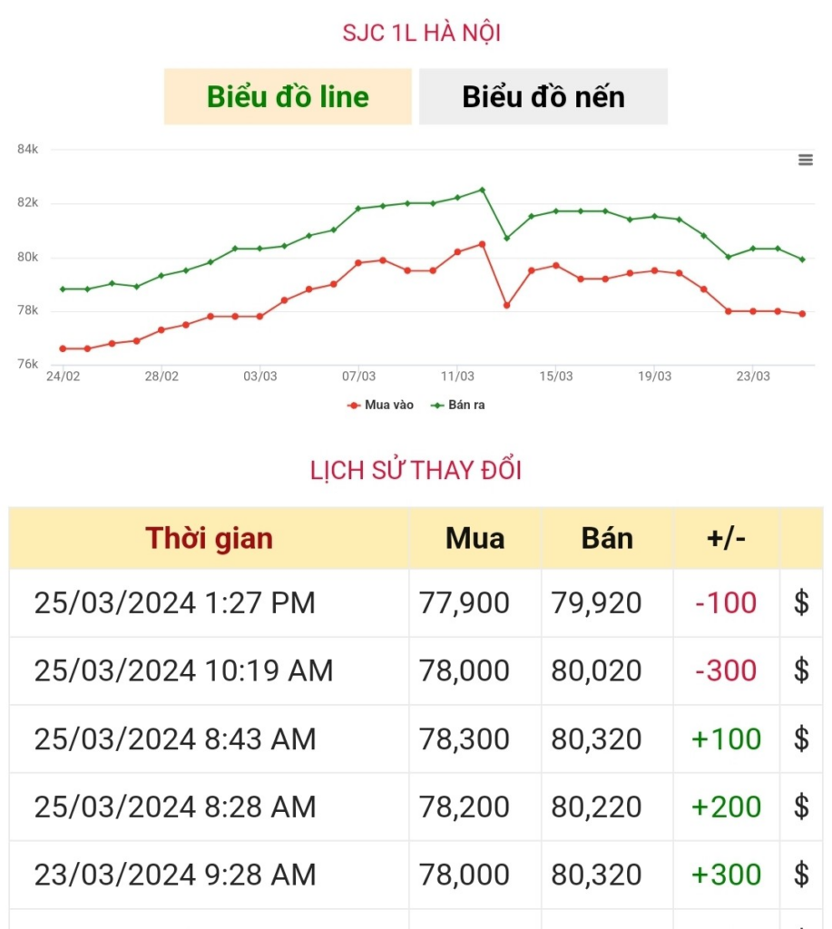 Cụ thể, tại thời điểm 17h30, ngày 25/3, SJC Hà Nội niêm yết giao dịch mua – bán tại mốc 77,90 – 79,92 triệu đồng/lượng, giảm 300.000 đồng/lượng cả hai chiều mua – bán so với giá mở cửa cùng ngày.