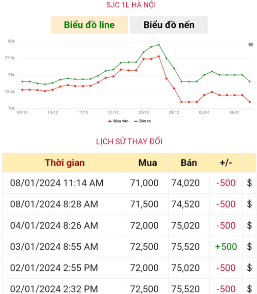 Cập nhật thời điểm 15h30, ngày 8/1, SJC Hà Nội niêm yết giao dịch mua – bán tại mốc 71,00 – 74,02 triệu đồng/lượng, giảm 500.000 đồng/lượng giá mua và bán so với mở cửa sáng nay.