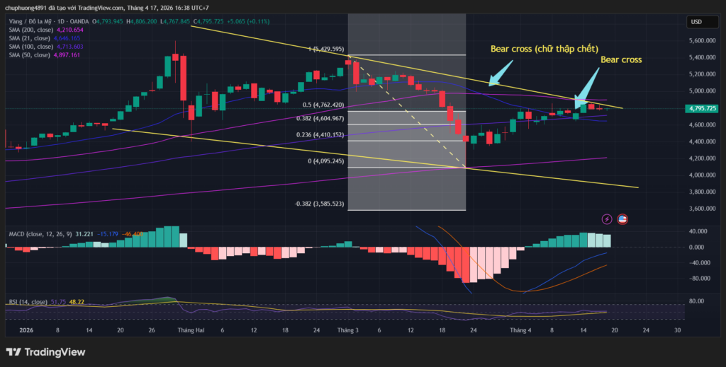 Trên biểu đồ hàng ngày, XAU/USD đang giao dịch quanh mức 4.789,50 USD, kẹt giữa các vùng hỗ trợ và kháng cự then chốt: