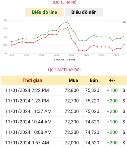 Cập nhật thời điểm 16h, ngày 11/1, SJC Hà Nội niêm yết giao dịch mua – bán tại mốc 72,80 – 75,32 triệu đồng/lượng, tăng 1 triệu đồng/lượng giá mua và bán so với mở cửa sáng nay.