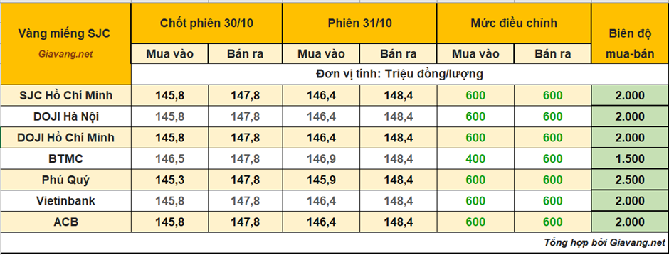 DOJI Hà Nội và Hồ Chí Minh, niêm yết giao dịch mua – bán ở mức 146,4 – 148,4 triệu đồng/lượng, giá mua tăng 600 nghìn đồng mỗi lượng và giá bán tăng 600 nghìn đồng so với giá chốt phiên 30/10.