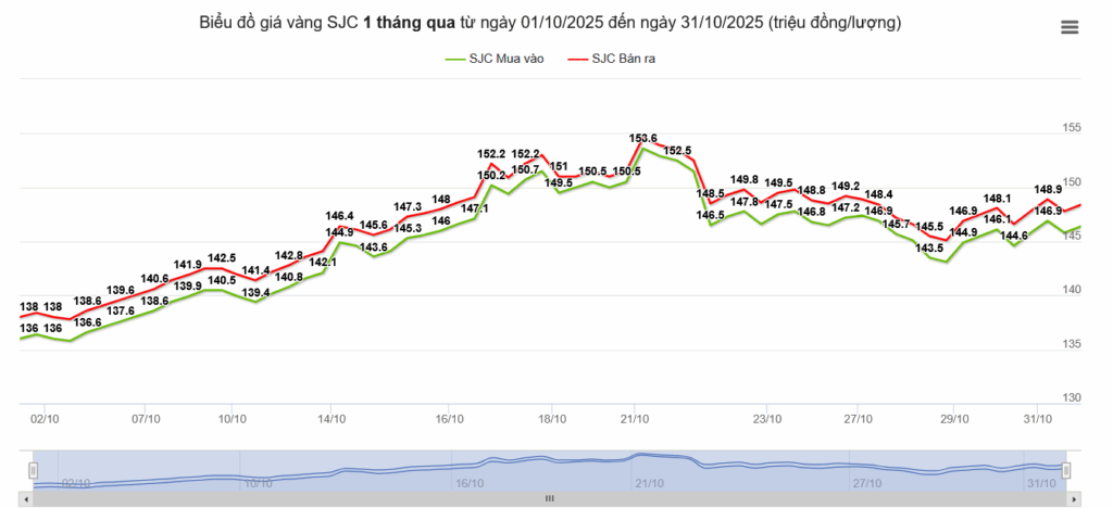 Cập nhật thời điểm 14h30 ngày 31/10, vàng miếng SJC Hồ Chí Minh niêm yết giao dịch mua – bán ở mức 146,4 – 148,4 triệu đồng/lượng, giá mua tăng 600 nghìn đồng mỗi lượng và giá bán tăng 600 nghìn đồng mỗi lượng so với cuối ngày hôm qua. Nếu so với mức giá khởi điểm tháng 10 là 136 – 138 triệu, mỗi lượng vàng SJC đã tăng hơn 10 triệu đồng mỗi lượng. Thị trường tạo đỉnh vào ngày 21/10 tại mức giá 153,6 – 154,6 triệu đồng mỗi lượng mua vào bán ra.