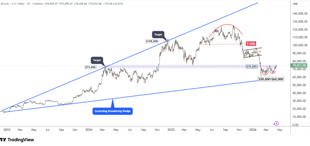 Hành động giá của Bitcoin đang phát triển cấu trúc tăng giá mạnh mẽ tại vùng hỗ trợ của mô hình Ascending Broadening Wedge (Nêm mở rộng hướng lên). Vùng giá từ $50,000 đến $60,000 đóng vai trò là “bệ đỡ” quan trọng cho chu kỳ này.