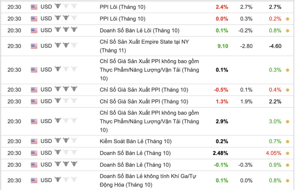 4. Chỉ Số Giá Sản Xuất PPI (Tháng 10): Có sự chênh lệch đáng kể giữa giá PPI thực tế và dự đoán (-0.5% so với 0.1% và 1.3% so với 1.9%). Sự giảm này cho thấy áp lực lạm phát từ phía sản xuất giảm, điều này có thể hỗ trợ cho giá vàng.