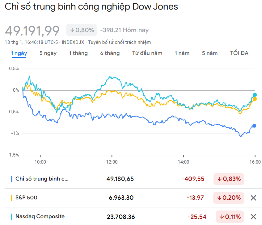 Chỉ số Dow Jones mất 398,21 điểm, tương đương 0,8%, xuống 49.191,99 điểm.