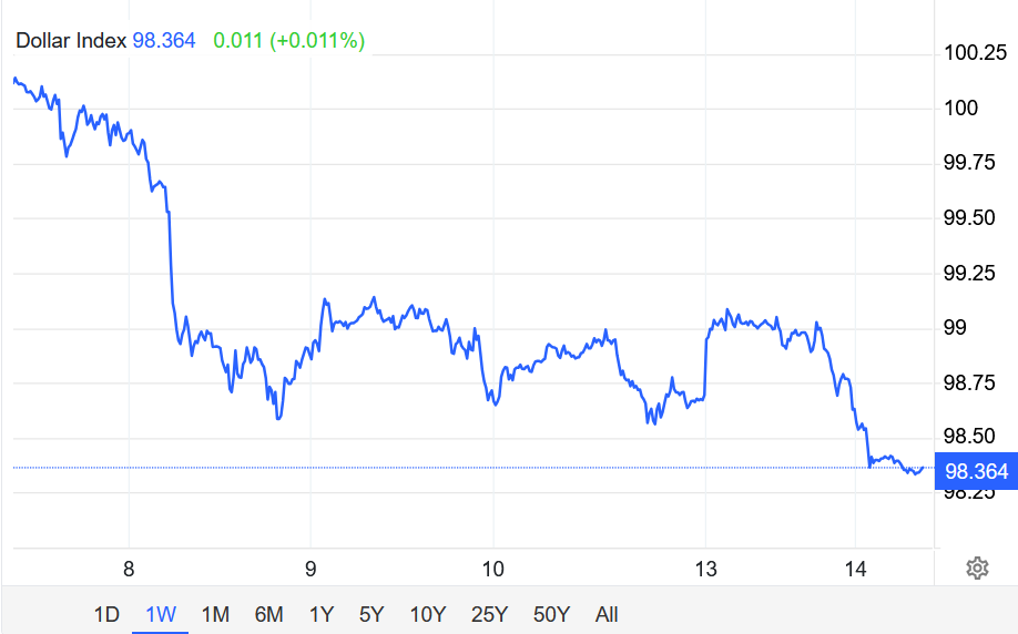 Chỉ số USD giảm xuống khoảng 98,3 vào thứ Hai khi nhà đầu tư chuyển sang các tài sản rủi ro hơn, nhờ kỳ vọng rằng một thỏa thuận giữa Mỹ và Iran cuối cùng có thể đạt được.