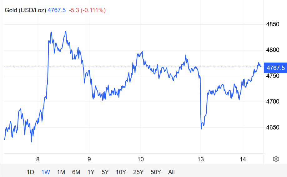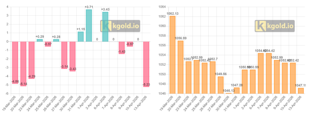 Giá vàng suy yếu trong ngày 13/04, chịu áp lực từ đồng USD mạnh lên và sự sụp đổ của các cuộc đàm phán Mỹ–Iran vào cuối tuần, yếu tố làm dấy lên lo ngại lạm phát và phủ bóng lên triển vọng cắt giảm lãi suất trong tương lai.