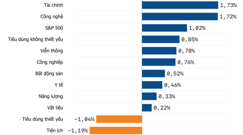 Bảng điện tử S&P 500 chứng kiến sự bứt phá của cổ phiếu Công nghệ và Tài chính. 2 nhóm ngành tiêu cực gây áp lực lên chỉ số là Tiện ích và Tiêu dùng thiết yếu.
