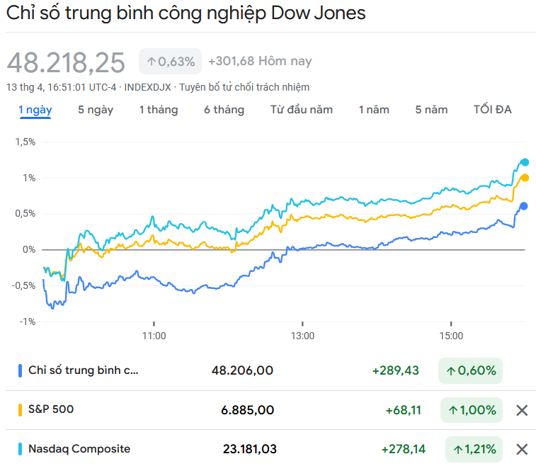 Chỉ số Dow Jones tăng 301,68 điểm, tương đương 0,63%, lên 48.218,25 điểm. Chỉ số này đã phục hồi từ mức giảm hơn 400 điểm, tương đương khoảng 0.9%, vào đầu phiên.
