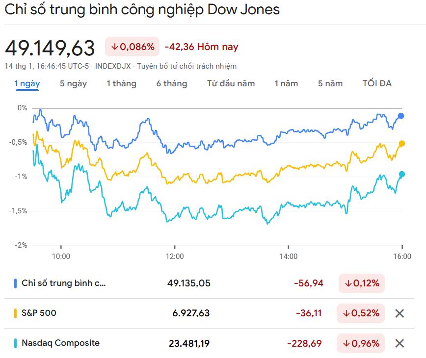 Chỉ số Dow Jones mất 42,36 điểm, tương đương 0,09%, xuống 49.149,63 điểm.
