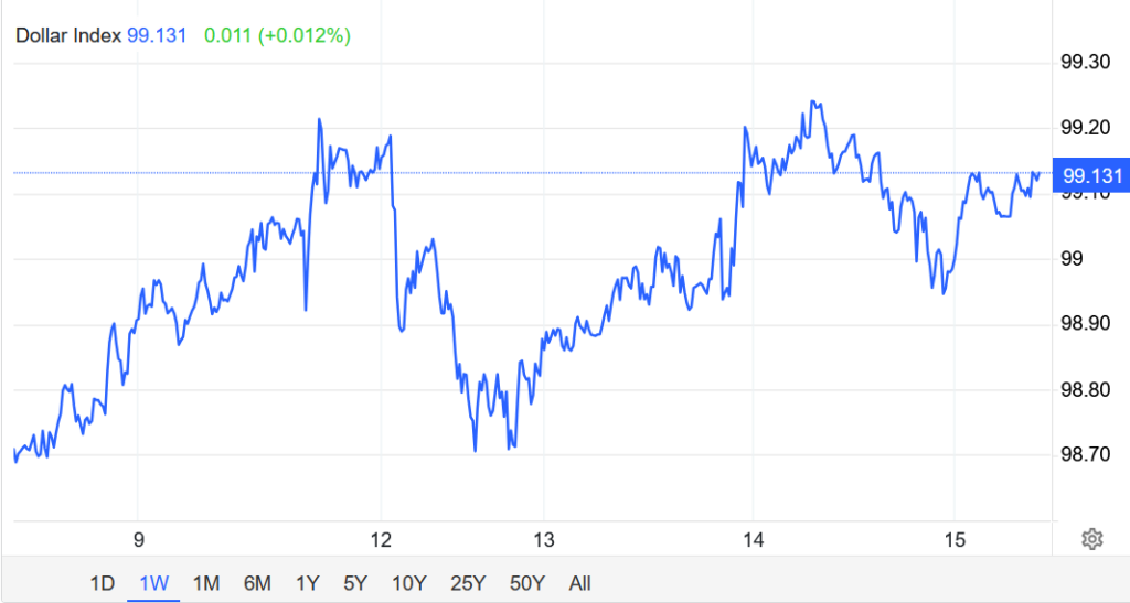 Hôm thứ Tư, Chỉ số DXY giữ quanh mốc 99, giảm nhẹ so với mức đỉnh một tháng được thiết lập trước đó trong phiên, khi thị trường tiếp tục đánh giá quy mô các đợt cắt giảm lãi suất mà Cục Dự trữ Liên bang Mỹ (Fed) có thể thực hiện trong năm nay.