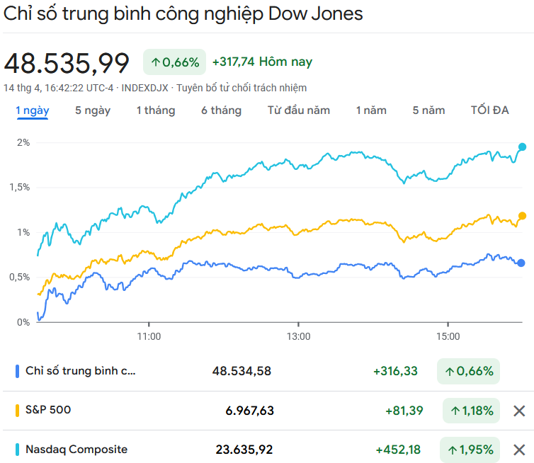 Chỉ số Dow Jones tăng 317,74 điểm, tương đương 0,66%, lên 48.535,99 điểm.
