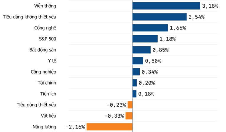 Bảng điện tử S&P 500 ghi nhận đà tăng mạnh của cổ phiếu Viễn thông – Tiêu dùng không thiết yếu. Ở chiều giảm, Năng lượng gây áp lực lớn tới chỉ số.