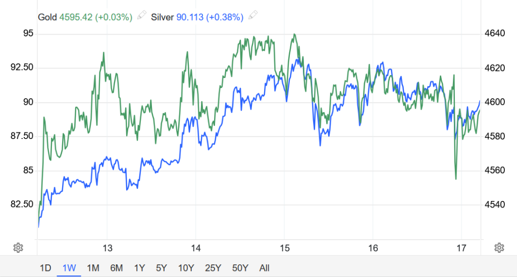 Giá bạc giao ngay giảm 3,6%, xuống 89 USD/oz, dù vẫn đang hướng tới mức tăng hơn 12% trong cả tuần, sau khi lập đỉnh lịch sử 93,57 USD/oz trong phiên trước.