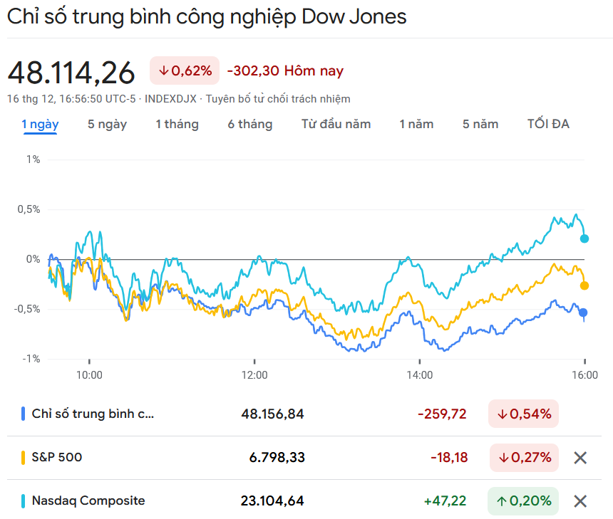Chỉ số Dow Jones giảm 302,30 điểm, tương đương 0,62%, đóng cửa ở mức 48.114,26 điểm.