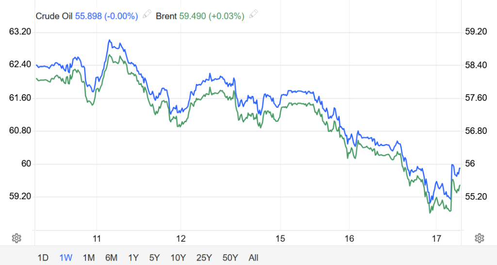 Hợp đồng dầu Brent tương lai giảm 2,71%, tương đương 1,64 USD, chốt phiên ở mức 58,92 USD/thùng.