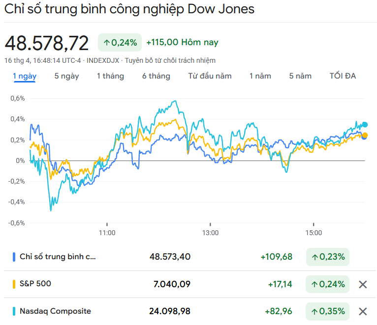 Chỉ số Dow Jones tăng 115 điểm, tương đương 0,24%, lên 48.578,72 điểm.