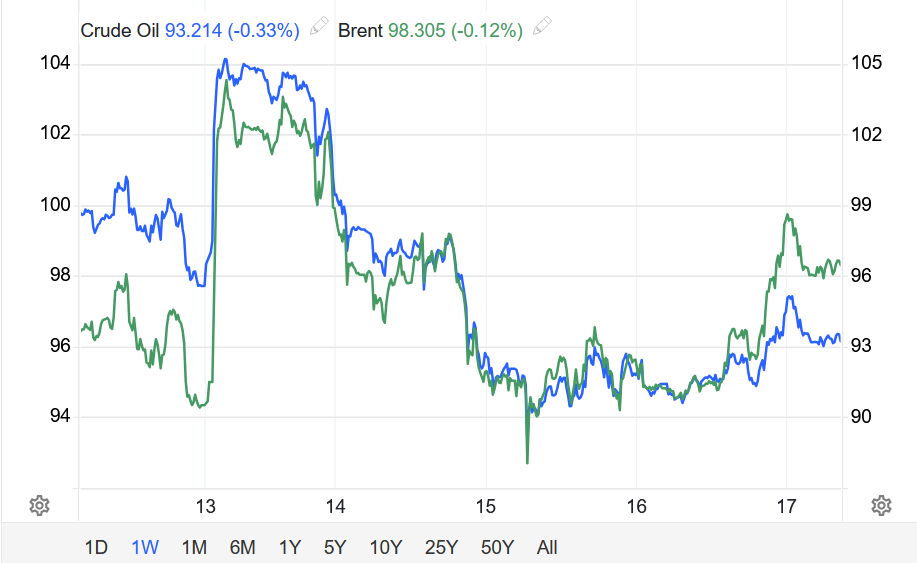 Khép phiên ngày 16/04, hợp đồng dầu Brent giao tháng 6 tăng gần 5%, chốt phiên ở mức 99,39 USD/thùng.