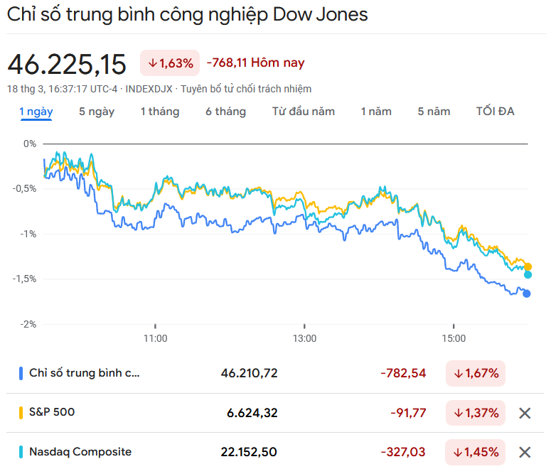 Đóng cửa phiên giao dịch thứ Tư ngày 18/3, chỉ số Dow Jones mất 768,11 điểm, tương đương 1,63%, đóng cửa ở 46,225.15 điểm – mức thấp mới trong năm 2026 và nằm dưới đường trung bình 200 ngày (MA200). Với mức giảm hơn 5% từ đầu tháng, Dow Jones đang trên đà ghi nhận tháng tệ nhất kể từ năm 2022.