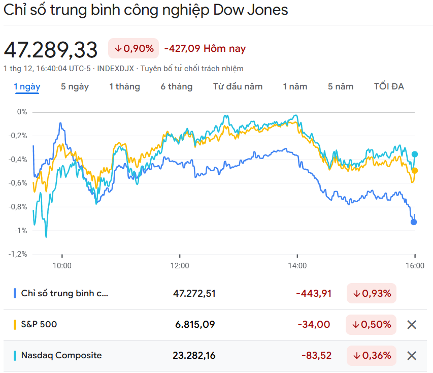 Chỉ số Dow Jones giảm 427,09 điểm (tương đương 0,9%) xuống 47.289,33 điểm.