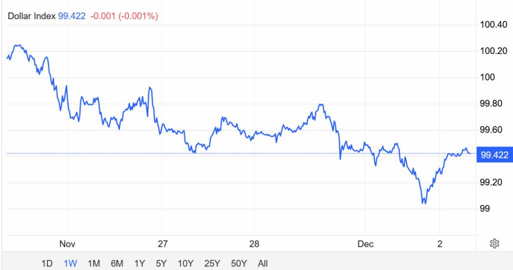 Chỉ số DXY giảm xuống dưới 99,2 trong ngày giao dịch đầu tiên của tháng 12, nối dài mức giảm 0.3% của tháng 11, khi giới giao dịch tiếp tục định giá khả năng cao Fed sẽ cắt giảm 25 điểm cơ bản lãi suất quỹ liên bang vào tuần tới. Xác suất thị trường cho động thái này hiện vượt 87%.