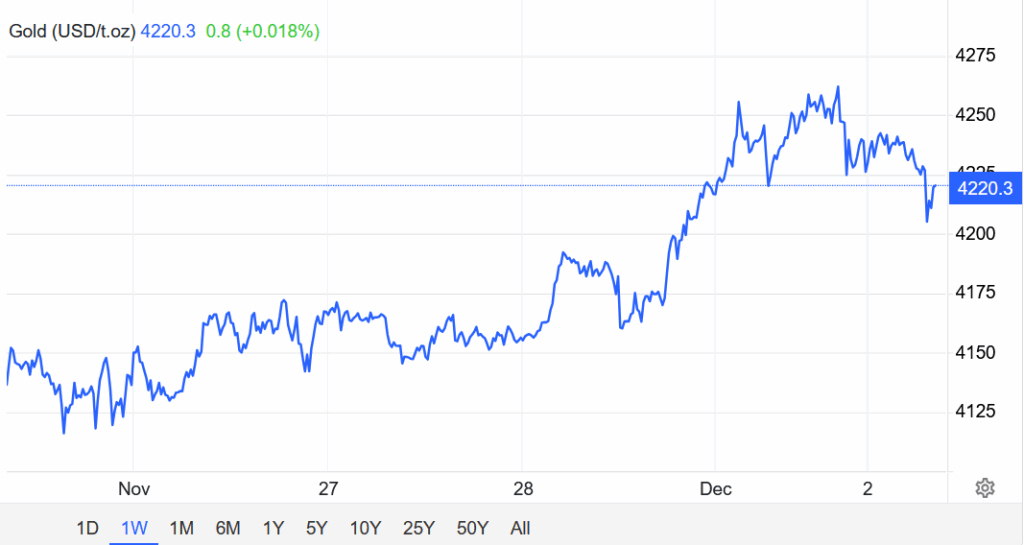 Kết thúc phiên giao dịch ngày 01/12, hợp đồng vàng giao ngay tiến 0,2% lên $4239,35/oz và đạt mức cao nhất kể từ ngày 21/10.