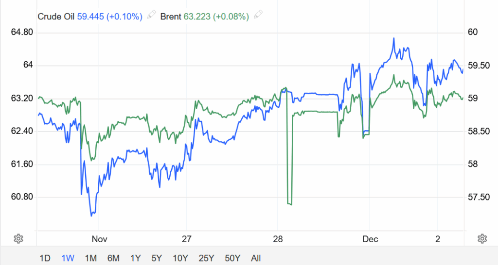 Kết thúc phiên giao dịch ngày 01/12, hợp đồng dầu Brent tiến 79 xu (tương đương 1,27%) lên 63,17 USD/thùng.