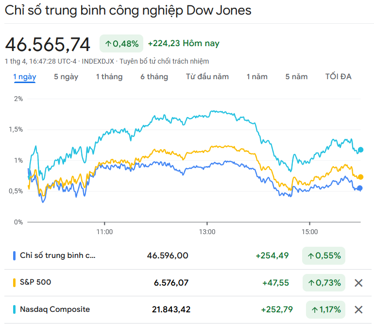 Cùng chiều, chỉ số Dow Jones Industrial Average tăng 224,23 điểm, tương đương 0,48%, lên 46.565,74 điểm.