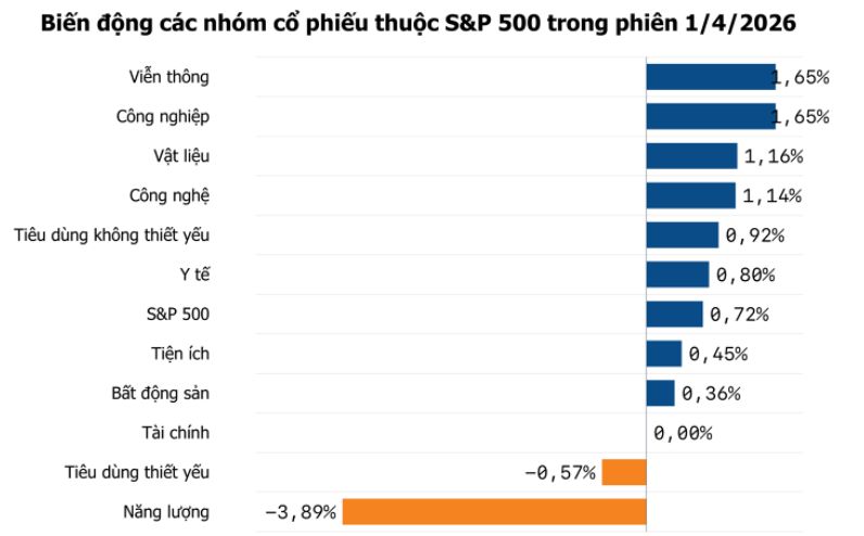 Bảng điện tử S&P 500 chỉ có 2 nhóm ngành giảm điểm. Năng lượng bị bán mạnh nhất do giá dầu giảm. Viễn thông – Công nghiệp dẫn đầu xu hướng tăng.