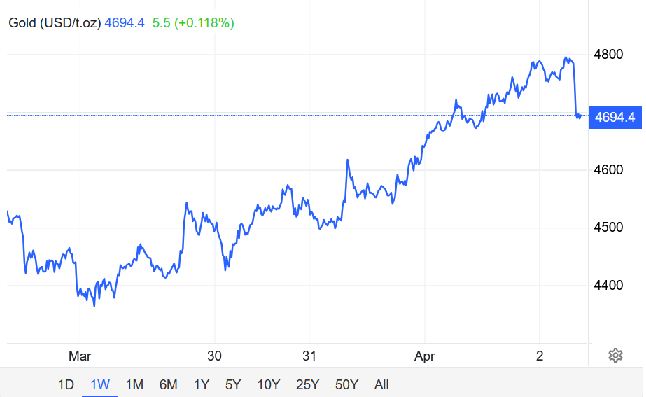 Giá vàng giao ngay tăng 2,5% lên $4784,22/oz, mức cao nhất kể từ 19/03.