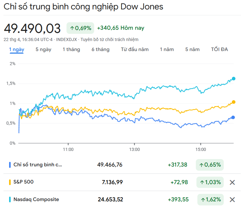Chỉ số Dow Jones tăng 340,65 điểm, tương đương 0,69%, lên 49.490,03 điểm.