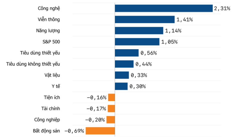 Bảng điện tử S&P 500 chứng kiến đà tăng ấn tượng của cổ phiếu Công nghệ – Viễn thông – Năng lượng.