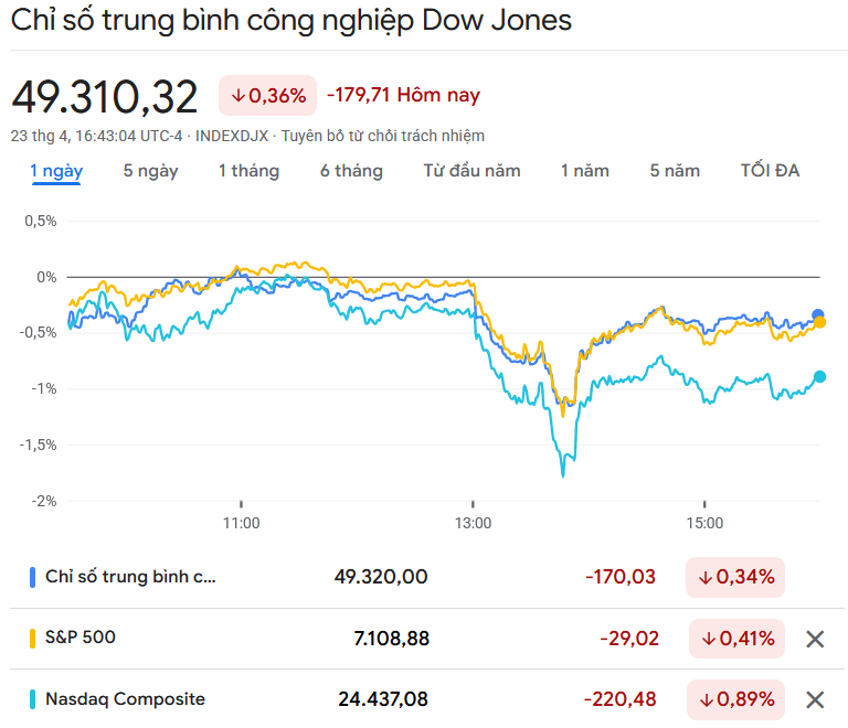 Chỉ số Dow Jones giảm 179,71 điểm, tương đương 0,36%, xuống 49.310,32 điểm.