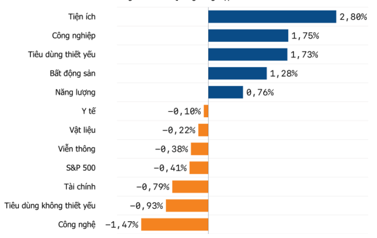Bảng điện tử S&P 500 phân hóa khá mạnh. Cổ phiếu Tiện ích bứt tốc gần 3% trong khi cổ phiếu Công nghệ và Tiêu dùng không thiết yếu lại đi xuống.