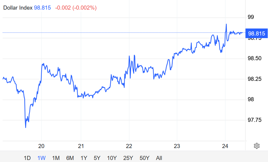 Chỉ số đô la Mỹ dao động quanh mức 98,6 vào thứ Năm, duy trì gần mức cao nhất trong hai tuần, khi các nhà giao dịch tiếp tục tập trung vào căng thẳng leo thang giữa Mỹ và Iran. Sự không chắc chắn xung quanh các cuộc đàm phán hòa bình vẫn còn, trong khi những phát ngôn từ hai phía vẫn rất gay gắt.