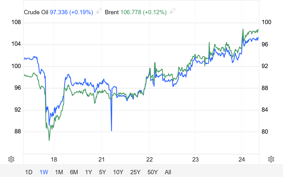 Khép phiên ngày 23/04, dầu Brent tăng khoảng 3% lên 105,07 USD/thùng.