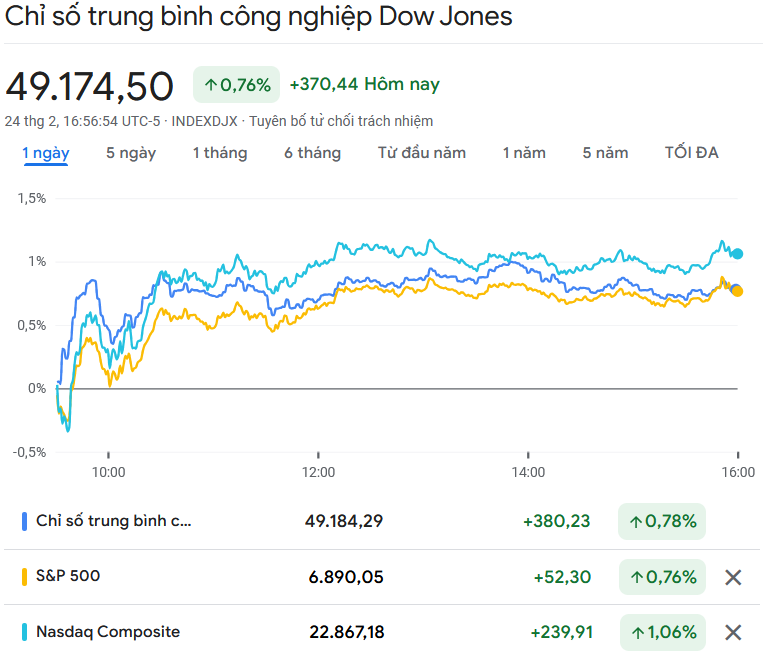 Chỉ số Dow Jones tăng 370,44 điểm, tương đương 0,76%, lên 49.174,50 điểm.