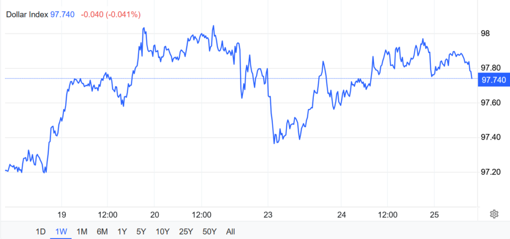 Chỉ số USD đã tăng trở lại vượt mốc 97,8 vào thứ Ba sau khi chịu áp lực trong phiên trước đó, khi các nhà đầu tư tiếp tục đánh giá mức độ bất ổn liên quan đến chính sách thương mại của Mỹ.