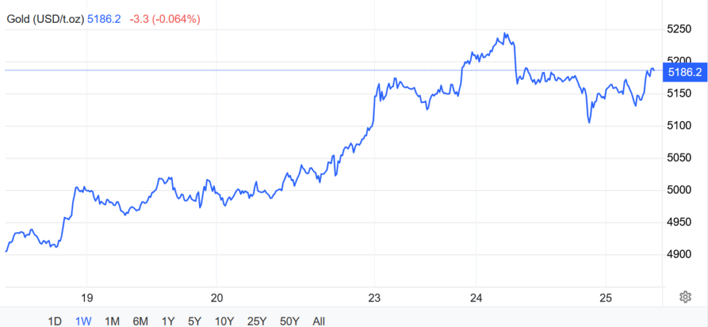 Chốt phiên giao dịch, giá vàng giao ngay giảm 1,4% xuống 5.158 USD/ounce và giá vàng giao tháng 4 giảm 0,9% xuống 5.176 USD.