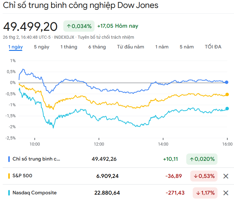 Ở chiều ngược lại, chỉ số Dow Jones nhích nhẹ 17.05 điểm, tương đương 0.03%, lên 49,499.20 điểm.